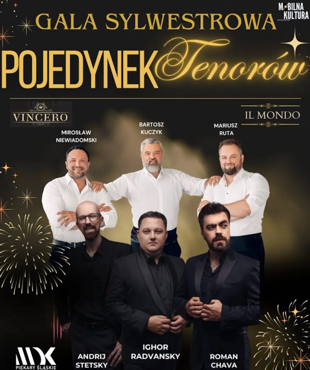 „Wielka Gala Sylwestrowa – Pojedynek Tenorów”. Tenorzy Vincero & Tenorzy Il Mondo – 6 głosów, dwie drużyny, jeden wieczór pełen muzycznych emocji! Zapraszamy na niezwykłą Noc Sylwestrową, podczas której sceną zawładnie sześciu charyzmatycznych tenorów – trzech z Polski (Bartosz Kuczyk, Mirosław Niewiadomski, Mariusz Ruta) i trzech z Lwowa (Roman Chava, Igor Radwański, Andrej Stetsky) – by stoczyć pełen pasji, głosu i sztuki pojedynek muzyczny. Dwa zespoły: Tenorzy Vincero oraz Tenorzy Il Mondo zmierzą się w przyjacielskiej, artystycznej rywalizacji, prezentując swoje największe atuty – potężne głosy, sceniczną elegancję i ogromną emocjonalność.